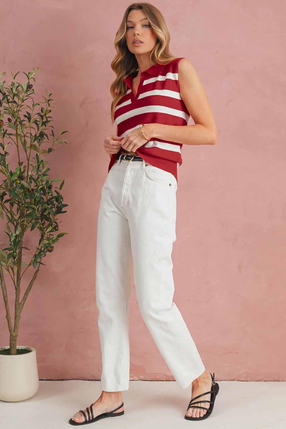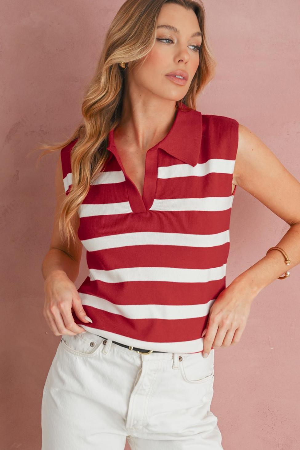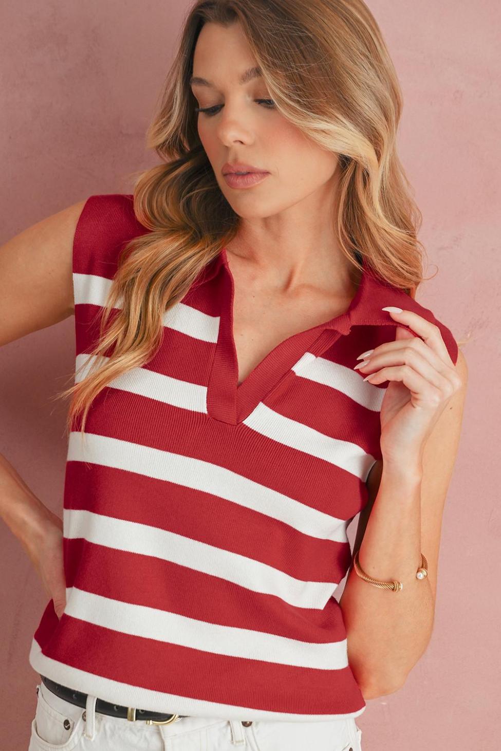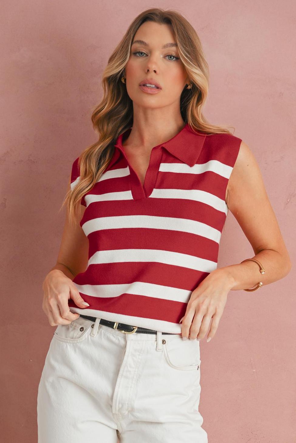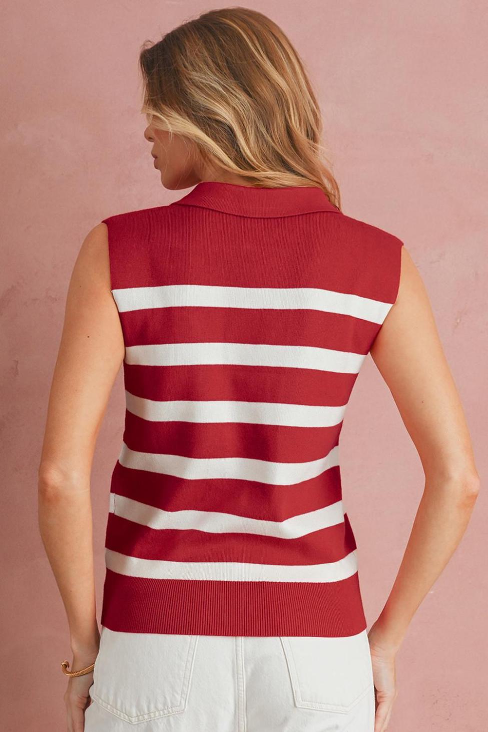 - Effortlessly Chic, This Knit Vest Features A Striking Red Striped Design That Adds A Pop Of Color To Any Outfit.