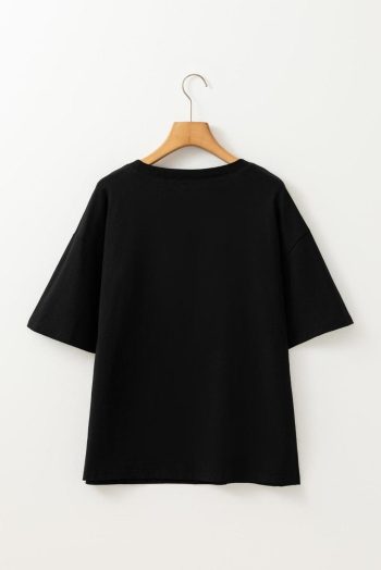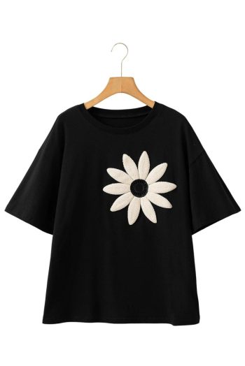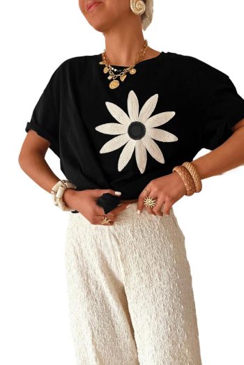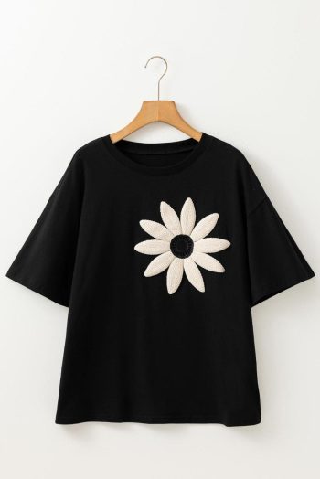 T Shirts | Black Crochet Floral Patched Drop Shoulder Loose Tee – Women